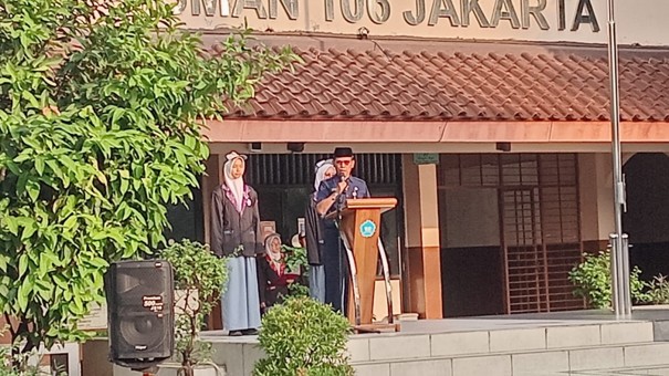 Bertindak sebagai pembina apel yang dipimpin oleh kepala SMAN 106 – Bapak Surata, M.Pd. Dalam sambutannya Pembina apel secara pribadi mengucapkan mohon maaf lahir dan batin kepada peserta apel. Pak surata juga menyampaikan mengenai kebersihan diri dan lingkungan sekolah, bijak menggunakan gawai, mengikuti lomba-lomba berjenjang maupun tidak berjenjang, dan mendapatkan hasil SNBP yang maksimal.